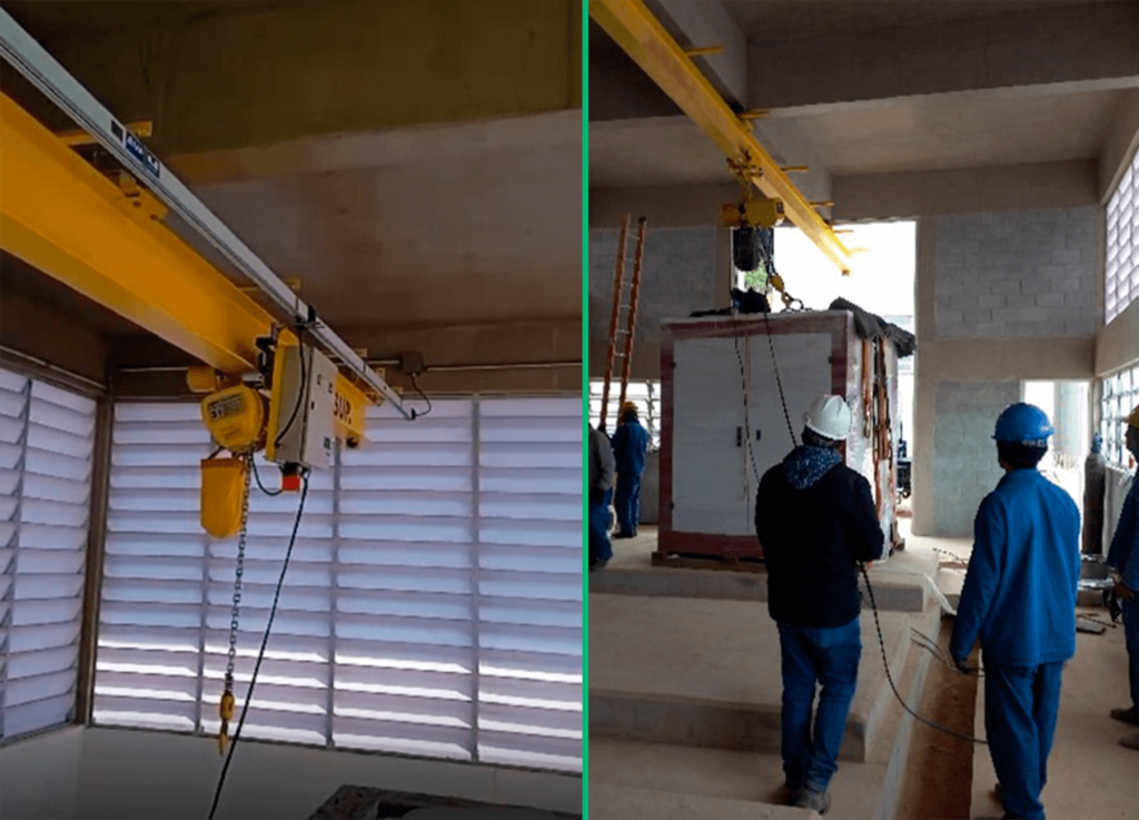 Instalação e comissionamento de equipamentos de transporte para içamentos de cargas tipo, talhas com trilhos elétricos.